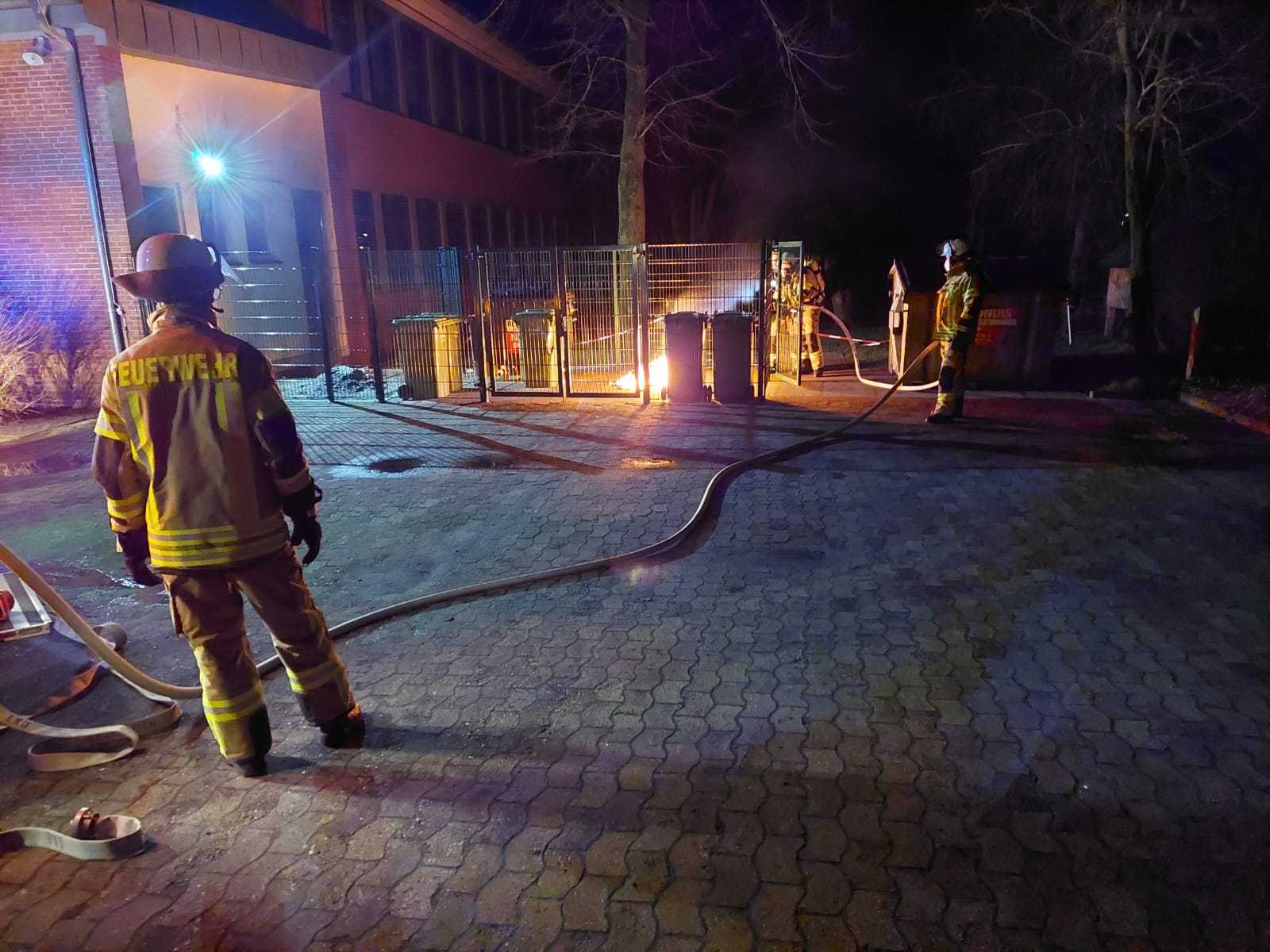 Eine brennende Mülltonne auf dem Gelände der Grundschule Harpstedt gab am Montagabend Anlass zur Alarmierung der Feuerwehr Harpstedt. Auf einem Abstellplatz für Mülltonnen brannte eine Papiertonne und drohte auf weitere Tonnen überzugreifen. Nach dem eintreffen der ersten Einsatzkräfte wurde ein Löschangriff aufgebaut und zeitgleich durch einen Trupp unter umluftunabhängigen Atemschutz weitere Papiertonnen aus dem Gefahrenbereich entfernt. Nach einer viertel Stunde konnte ,,Feuer aus“ gemeldet werden.
