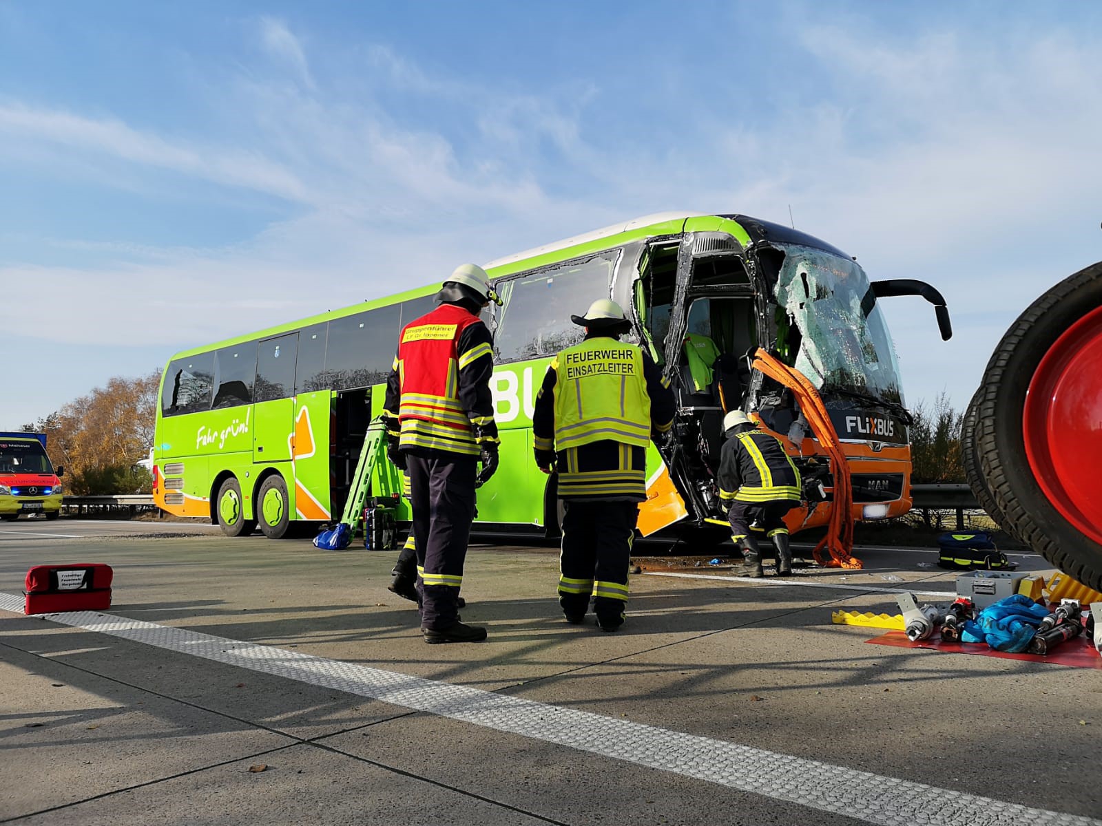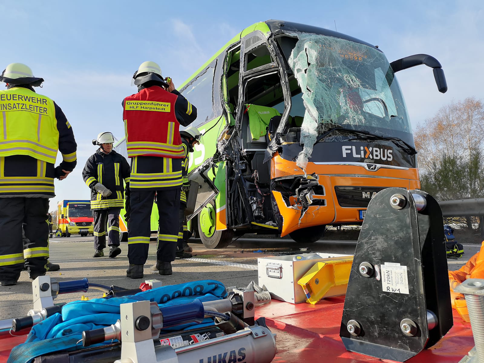 Ein erneuter schwerer Unfall beschäftigte die Feuerwehren Groß Ippener, Harpstedt und Groß Mackenstedt am Mittwochvormittag auf der A1. Zwischen der Anschlussstelle Groß Ippener und dem Autobahndreieck Stuhr kam es zu einem Auffahrunfall mit einem Reisebus und einem Silo Lastwagen. Durch den Aufprall wurde die Beifahrerseite des Busses stark deformiert und der dort sitzende Beifahrer schwer verletzt eingeklemmt. Aufgrund der Meldung rückte die Feuerwehren nach der Sonderalarm- und Ausrückeordnung zu der Einsatzstelle aus. Um an den verletzten Beifahrer zu gelangen wurde mit Hilfe der Seilwinde und zwei hydraulischen Stempeln die Front des Busses nach vorne gezogen bzw. gedrückt. Nach ca. 40 Minuten konnte der Beifahrer aus den Trümmern befreit und an den Rettungsdienst übergeben werden. Mit dem Rettungshubschrauber Christoph Weser wurde er in ein umliegendes Krankenhaus geflogen. Der Fahrer und die 10 Fahrgäste in dem Bus wurden nicht verletzt. Zur Betreuung wurden sie in das Mackenstedter Feuerwehrhaus gefahren. Bevor die Fahrt mit einem Ersatzbus weiter ging, wurde denen Getränke und Knabbereien zur Verfügung gestellt. Nach gut zwei Stunden war der Einsatz für die Feuerwehren beendet.