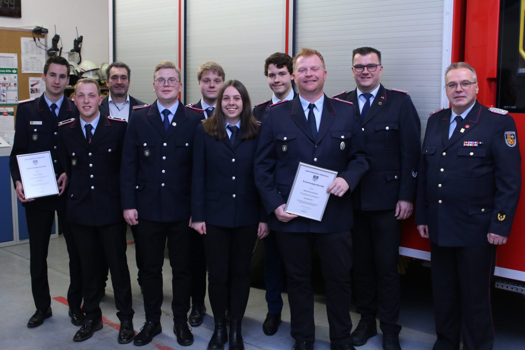 Den Abschluss der Veranstaltung bildeten Beförderungen und Ehrungen. Verdiente Kameraden erhielten neue Dienstgrade: Eike und Merten Hüffermann wurden zu Feuerwehrmännern, Merle Brandes zur Oberfeuerwehrfrau und Mathis Nienaber zum Oberfeuerwehrmann befördert. Leon Nixdorf wurde zum Hauptfeuerwehrmann befördert. Gemeindebrandmeister Nico Sparkuhl ernannte die Ortsbrandmeister Markus Kuraschinski und Marvin Hartje zu Brandmeistern.