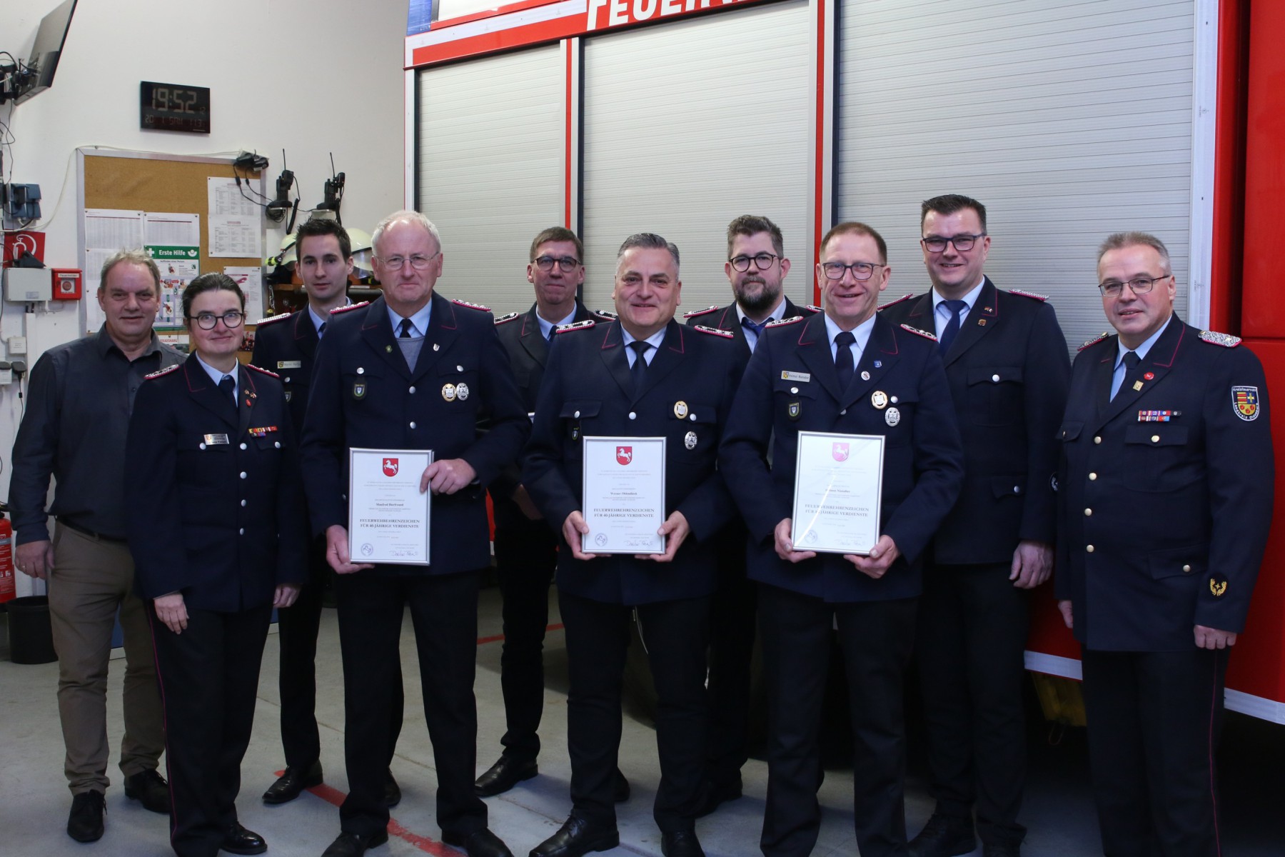 Für seine 25-jährige Mitgliedschaft wurde Burghard Otto geehrt, für 40-jährige Mitgliedschaft Helmut Nienaber, Manfred Bierfreund und Werner Ohlendieck. Mit dem Übertritt in die Altersabteilung wurden Hergen Lehnhof und Manfred Bierfreund mit dem silbernen Ehrenzeichen des Oldenburgischen Feuerwehrverbandes ausgezeichnet.