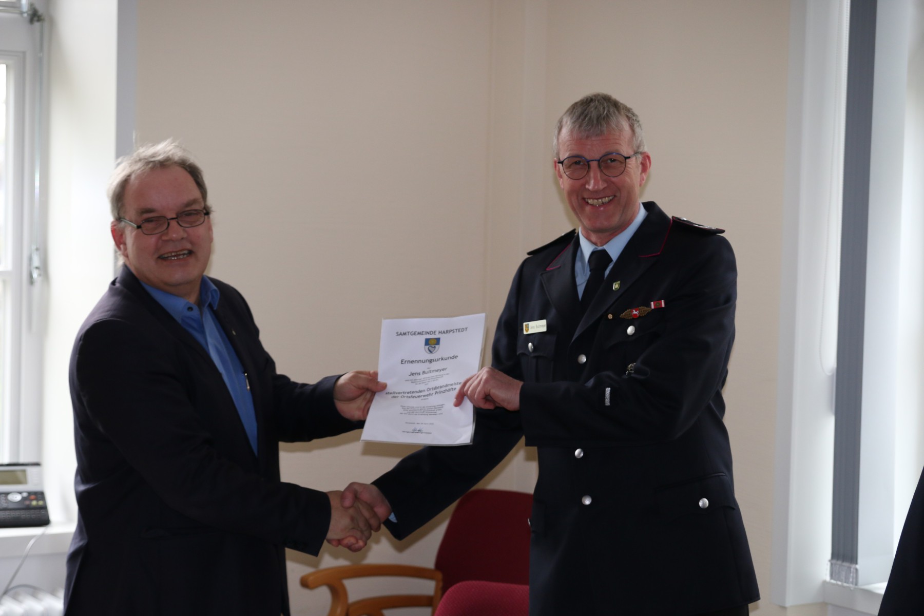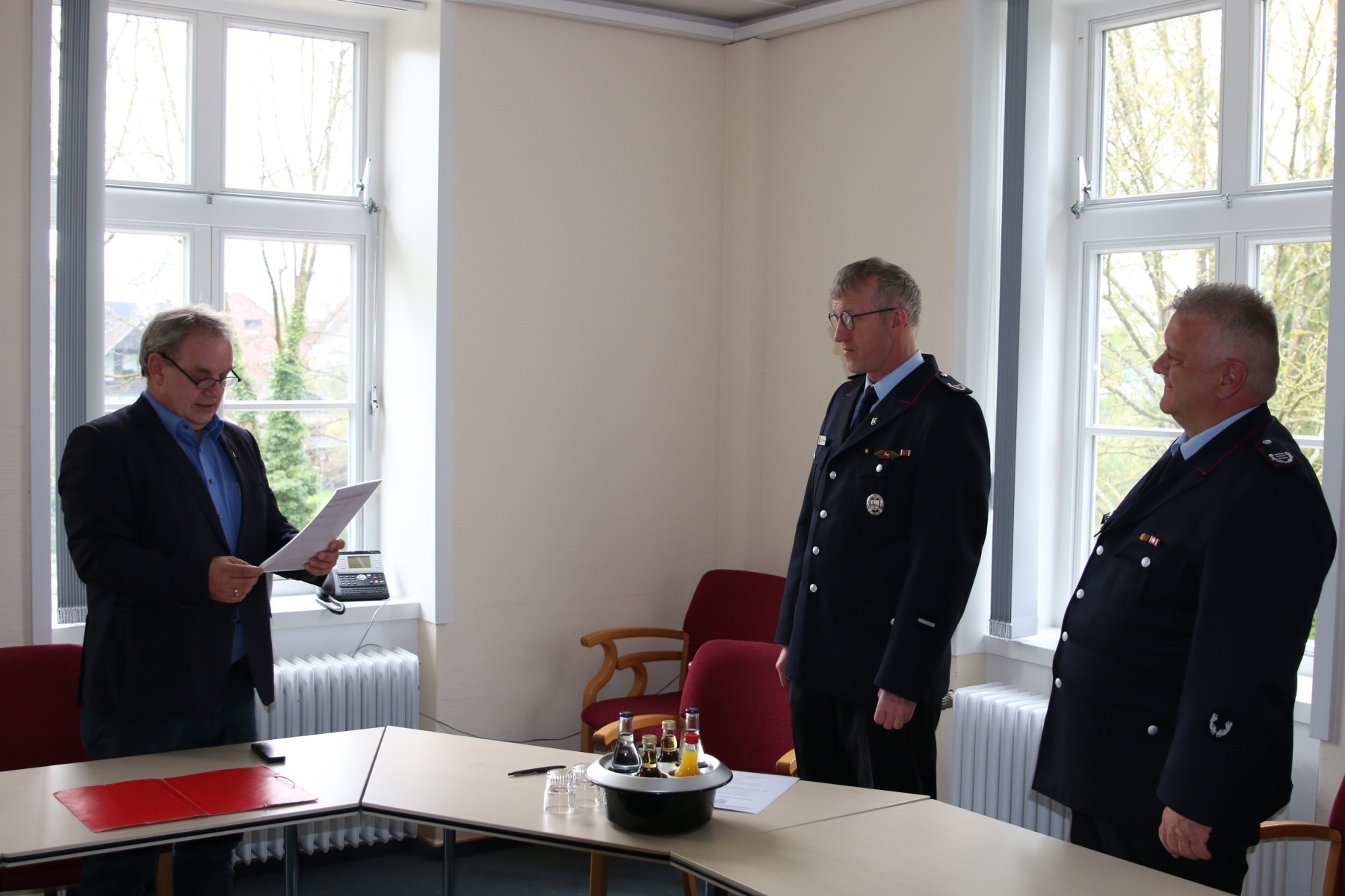 Im Rahmen einer kleinen Feierstunde ernannte Samtgemeindebürgermeister Yves Nagel die beiden erneut für weitere sechs Jahre zum Ortsbrandmeister beziehungsweise stellvertretenden Ortsbrandmeister und berief sie in das Ehrenbeamtenverhältnis.